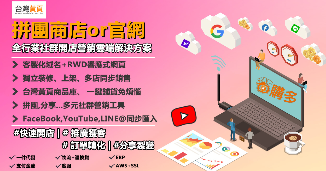 1.免寫程式,即可快速建立自己的專屬線上商店。 2.會員集客機制、分銷、分潤等豐富功能,一網打盡各種網店行銷,刺激顧客下單、提升顧客回購率。 3.台灣黃頁商品庫系統支持,讓商店商品更加多元,上架商品多店共享,讓銷售渠道不侷限於自己。 4.最強團購,分享、開團、拼團、揪團、成團系統 5.台灣黃頁省購多提供商店、品牌私域經營必備的系統與技術支持,省去大量開發成本,專注於自身業務開發。